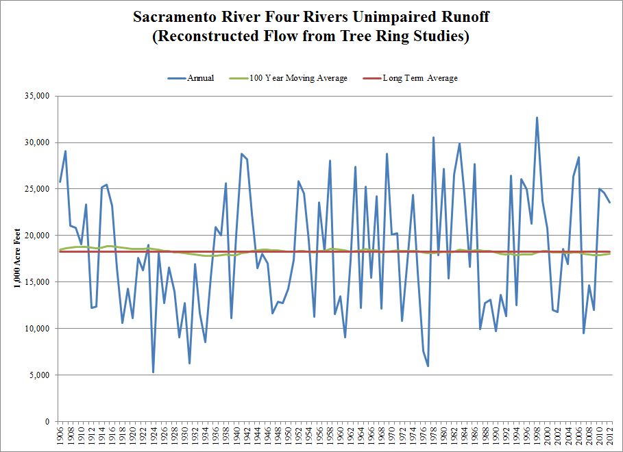 Boy, was I wrong. The annual unimpaired runoff of the Sacramento River Four River Index averaged 18.3 million acre-feet from the year 900 through 2012 — the period that the DWR study reconstructed unimpaired runoff from tree rings (see figure). Reflecting the fickleness of Mother Nature, there is a wide variability in annual flows. What surprised me was that the 100-year moving average has been stable for almost the seven plus centuries of data. It is difficult to find any footprint of climate change in this chart.