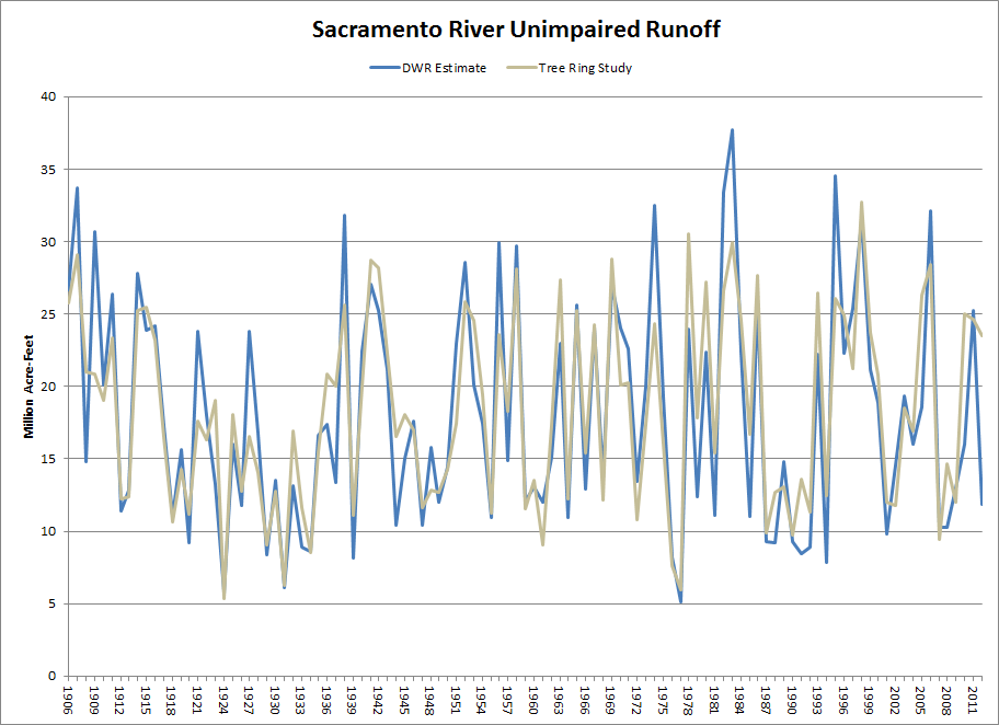 How do the estimates of unimpaired runoff from DWR compare with tree ring studies? Very well (see chart). The correlation (measure of the tendency of the two series to move together) is 0.86—in other words, annual variations in the unimpaired runoff estimated by the DWR Tree Ring study explains 75% of the annual variation in the unimpaired runoff estimated by DWR (and vice versa). While the series move together closely, they are not identical. Interestingly, the DWR Tree Ring study estimated unimpaired runoff for the Sacramento River at 23.5 million acre-feet in 2012 (last year estimated by study), while DWR’s estimate was only 11.8 million acre-feet.